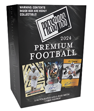 Leaf is proud to announce the return of a longtime Hobby favorite, Press Pass Football! 2024 Press Pass Premium will bring you the top football players from the past, present and future all on Metal technology. Look for the return of some fan favorite inserts and even more rare die-cut autograph cards. Every Box, on average, will contain 4 Base, 2 Base Parallels #’d to 35 or less, 4 Autograph or Retro Autograph cards #’d to 99 or less plus 1 Insert Autograph or Die-Cut Autograph #’d to 25 or less!