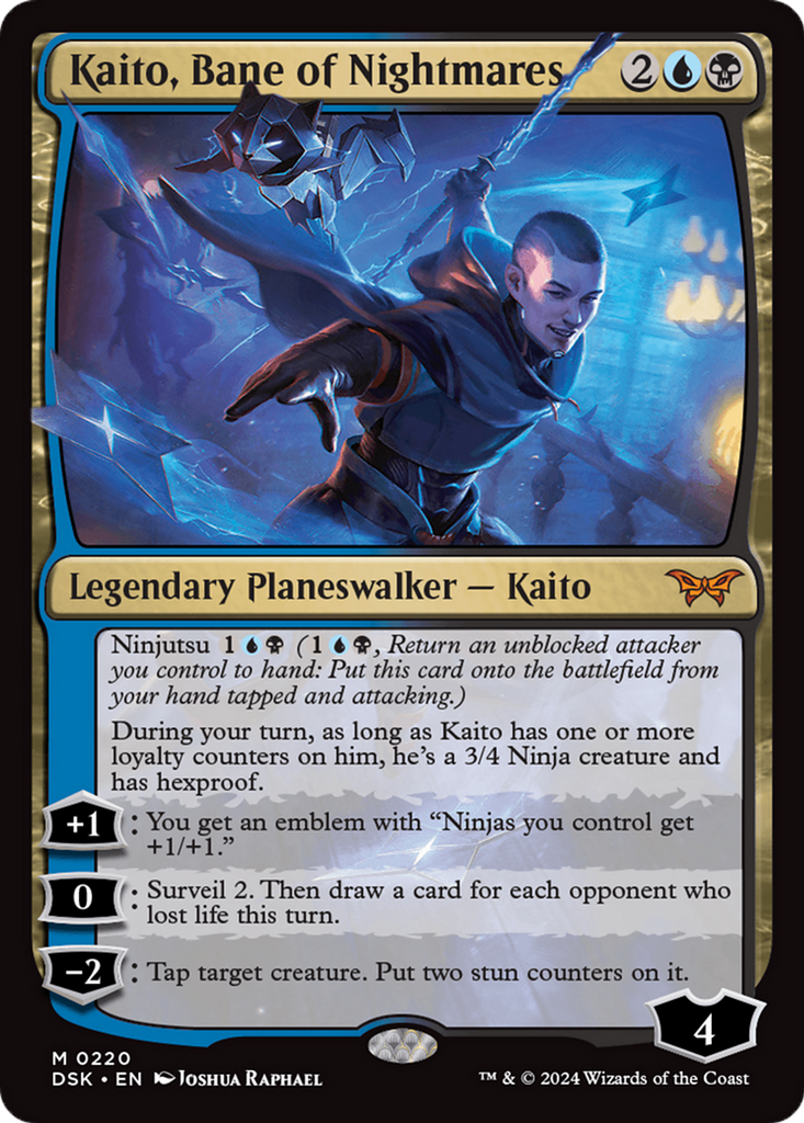Ninjutsu 1UB (1UB, Return an unblocked attacker you control to hand: Put this card onto the battlefield from your hand tapped and attacking.)During your turn, as long as Kaito has one or more loyalty counters on him, he’s a 3/4 Ninja creature and has hexproof.[+1]: You get an emblem with “Ninjas you control get +1/+1.”[0]: Surveil 2. Then draw a card for each opponent who lost life this turn.[-2]: Tap target creature. Put two stun counters on it.