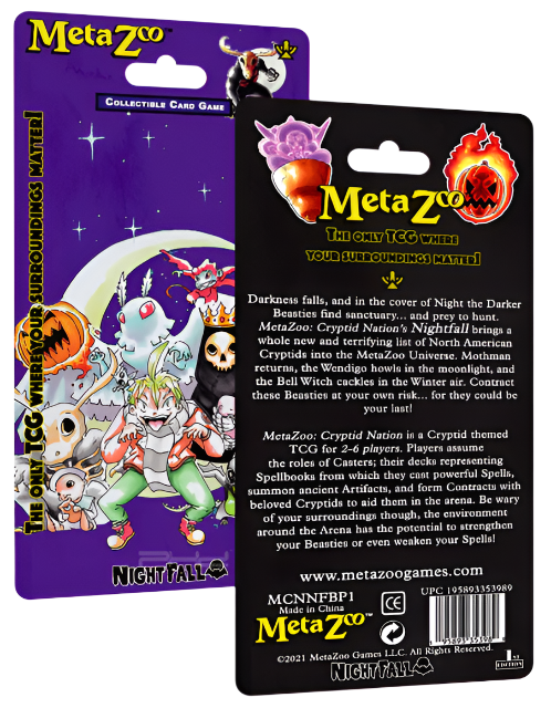 Darkness falls, and in the cover of Night the Darker Beasties find sanctuary… and prey to hunt. Meta Zoo: Cryptid Nation’s Nightfall brings a whole new and terrifying list of North American Cryptids into the MetaZoo Universe. Mothman returns, the Wendigo howls in the moonlight, and the Bell Witch cackles in the Winter air. Contract these Beasties at your own risk… for they could be your last! MetaZoo: Cryptid Nation is a Cryptid themed TCG for 2-6 players. Players assume the roles of Casters; their decks representing Spellbooks from which they cast powerful Spells, summon ancient Artifacts, and form Contracts with beloved Cryptids to aid them in the arena. Be wary of your surroundings though, the environment around the Arena has the potential to strengthen your Beasties or even weaken your Spells!