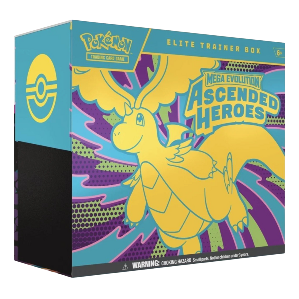 Rise to a New Challenge!Marvel at the awesome potential as Mega Dragonite ex takes flight, leading a gathering of all-star Pokémon to battle! Trainer’s Pokémon and Stellar Tera Pokémon ex join returning and newly discovered Mega Evolution Pokémon ex, including some with special artwork showing off their biggest and boldest attacks. Celebrate the stars of Scarlet & Violet and the dawn of Mega Evolution with the Pokémon TCG: Mega Evolution—Ascended Heroes expansion!The Pokémon TCG: Ascended Heroes Elite Trainer Box includes:• 9 Pokémon TCG: Ascended Heroes booster packs• 1 full-art foil promo card featuring N’s Zekrom• 65 card sleeves• 40 Pokémon TCG Energy cards• A player’s guide to the Ascended Heroes expansion• 6 damage-counter dice• 1 competition-legal coin-flip die• 1 plastic coin• A collector’s box to hold everything, with 6 dividers to keep it organized• A code card for Pokémon Trading Card Game Live